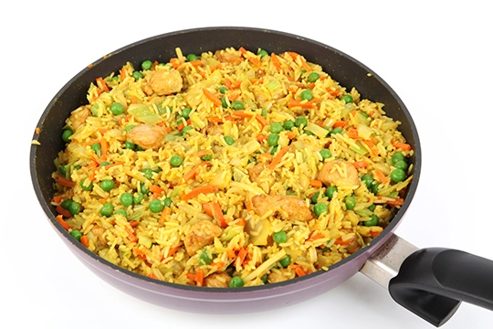 Salzwasser in einem Topf zum Kochen bringen und den Reis darin bissfest garen. Anschließend in ein Sieb abgießen. Die Zwiebel schälen und fein würfeln. Paprika waschen, entkernen und in Streifen schneiden. Tomate und Puten Schnitzel in Stücke nach Wahl schneiden. Das Öl in einer großen Pfanne erhitzen und die Schnitzelstücke hinzugeben. Fleisch mit Salz, Pfeffer und Paprika würzen. Daraufhin das Fleisch aus der Pfanne nehmen und warm stellen. Die Butter in die Pfanne geben und schmelzen. Zwiebeln und Paprikastreifen bei milder Hitze anbraten. Reis dazugeben. Eventuell nachwürzen. Putenschnitzel zufügen und ca. 10 Minuten mit dem Reis garen. Vor dem Servieren mit der Petersilie bestreuen.