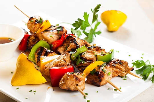 Abwechselnd mit frischen Gemüse auf Schaschlik-Spieße stecken, im Anschluss im heißen Fett ca. 5 min kräftig anbraten oder grillen.